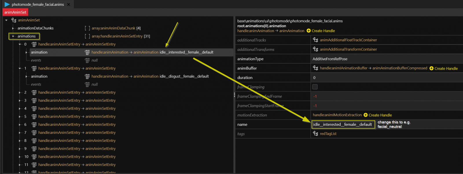 Do this by opening the file (photomode_female_facial.anims or photomode_male_facial.anims that you replaced with the NPC of your choice) in WolvenKit (or 010 if you know how to use it). Find the animation you want to use* and change its name.